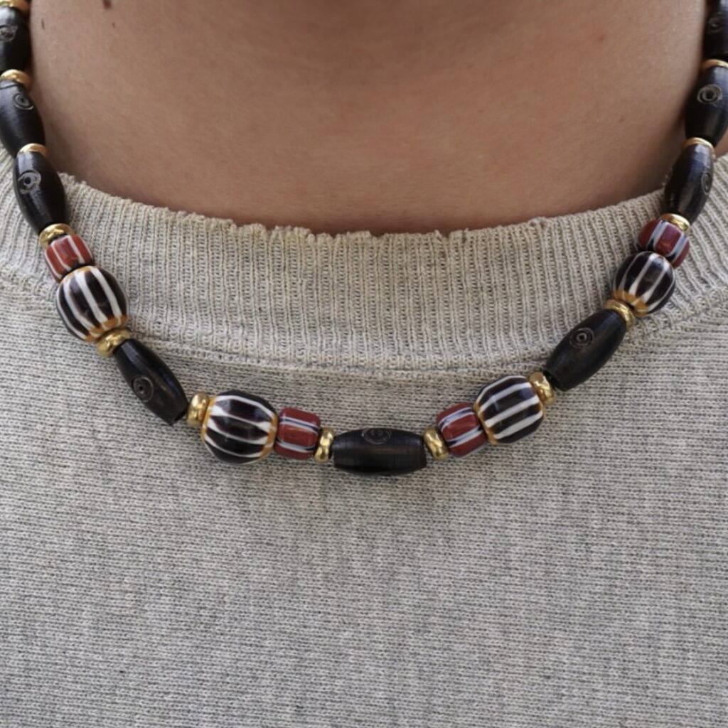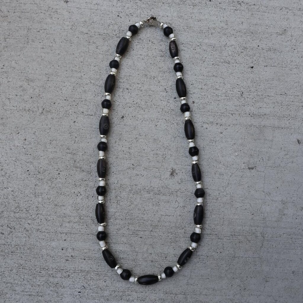 ヨーロッパ製のシェブロンビーズと、ホーンビース、真鍮製のビーズを組み合わせたネックレス。
